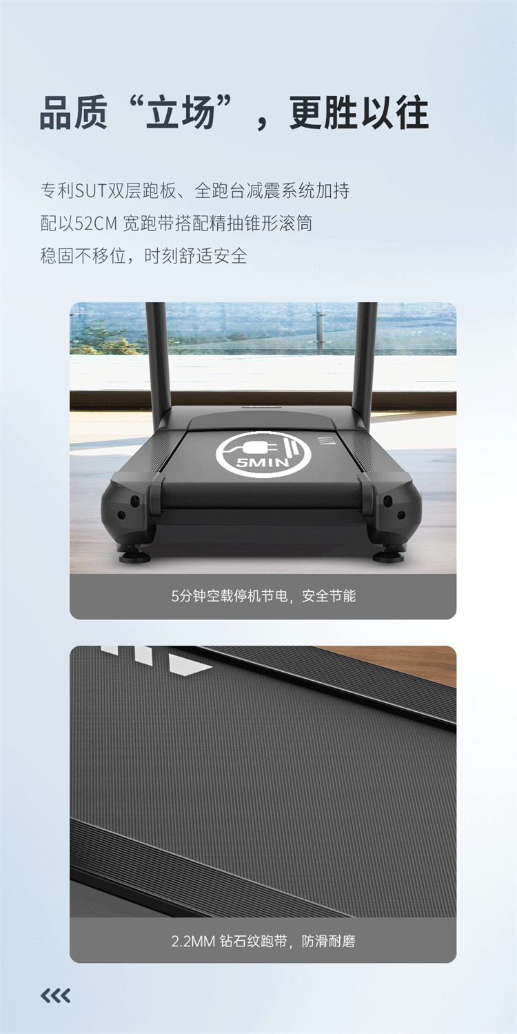 舒華家用跑步機SH-T5100持續馬力達1.25HP,具有500×1350mm的跑臺,運用無(wú)線(xiàn)心率接收模塊監測心率,運用6位硅膠減震設計,最大承重是126kg,可以滿(mǎn)足大多數家庭的使用。