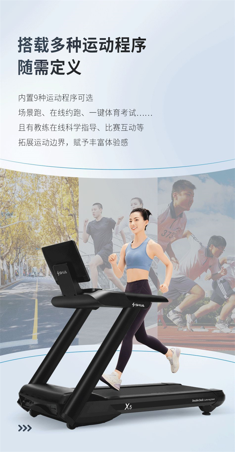 舒華X5 Pro豪華智能跑步機采用全新舒華跑步機系統,搭載21.5寸大屏,內置九種運動(dòng)程序,包括場(chǎng)景跑、在線(xiàn)約跑和一鍵體育考試等內容,亦有教練在線(xiàn)科學(xué)指導和比賽互動(dòng),可在線(xiàn)升級,歷經(jīng)耐久性測試,讓您使用更安全,雙跑臺設計,全減震系統,核心動(dòng)力采用F級耐高溫馬達,5.0HP峰值馬力,提供源源動(dòng)力,讓您享受每一次暢跑體驗。
